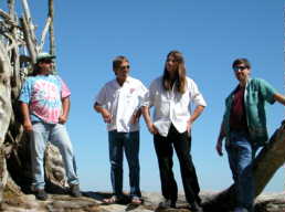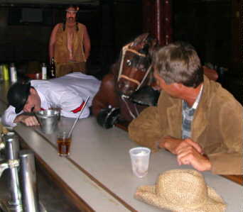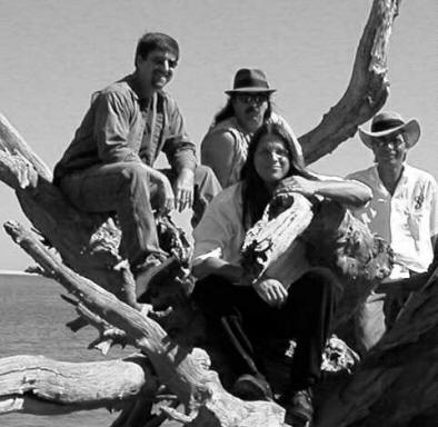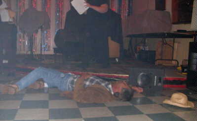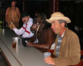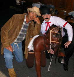 Tr: I actually wrote a lot of lyrics this time. I asked Gary to come over one day and I sat there with an acoustic and that's where it started. GF: I was more of an inspiration. Then he really took off in writing lyrics. He just needed a kick in the butt out of necessity. Tr: I actually got to play the roll of "Bass player" as well. Lot's of fun though. Especially "Tank". GF: The third movement of Tank sends chills down my spine. Two thumbs up! Tr: I knew that it had the potential to be a great song. I can't believe we actually pulled it off. It seems to be the most talked about song on the album and it's a six minute + instrumental which is normally unheard of. Definitely something we've never done before. The drums and some of the instrumentation in the third movement was actually a practice take but when it was all over, we said "That was great! Why do it again?" so that's the one we used. Glad to hear Gracie again as well though she had to think I was nuts giving her the Lawrence Welk treatment. Though the music of the band was at a high point, emotions were being stirred as Larry Z was making a move to Kill Devil Hills, NC. and Tr, facing personal problems was preparing for a life changing move as well. Tr: After I moved to Alabama, I set up a studio in a building in our "Starlight Ranch" which kind of sits toward the bottom of a mountain (in Alabama terms). The name actually came because there is a slew of pinholes in our barn (probably from a shot gun) and when the light's on at night, it looks like a bunch of stars from the outside. The studio's nice, it's just a little weird. I'll be recording a guitar solo and a big wasp will fly by my face or I'll be on the computer mixing tracks and our stallion "Mirage" will stick his head in the window and start nosing through my papers. So I'll be mixing tracks and yelling at my horse, telling him I'm out of pears and to go away. GF: Share your pear JK: Share Your Pair was the first song Gary ever wrote GF: Yes it was Tr: Really. I had no idea. Wrong album. GF: Speaking of horses, the photo shoot was really something. Tr: I was approached by the Fleet Reserve last Spring. They wanted me to be a horse for the club's birthday celebration their ladies' auxiliary was holding. Gracie was a cowgirl and I was her horse last Halloween and it went over very well. I was supposed to have a walk on-part for one of their songs but somehow I ended up being featured in the whole show, being forced to do pony tricks in front of everybody. Doesn't PETA require certain procedures for that kind of stuff? They also asked Gary to be a cowboy who gets shot. GF: Yes they shot me and I fell with my head right next to one of the speakers. Then there was this horrible feedback shriek! Tr: Larry got off lucky. He dressed up as a piano player but he didn't have to get on the floor. I think his piano ended up in the pool, though. We went to the back with Captain Rod, Gracie, and a bucket of oats and had a photo session. It was a lot of fun, except John took a wrong turn and showed up at a cavalry convention dressed as an Indian.